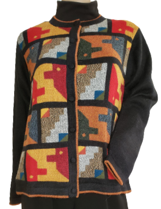 Classic, Elegant and easy to wear a button-front sweater with Andean geometric patterns on the front, representing the vibrant patterns of the fortress of Machu Picchu city showing the amazing masonry and stone work skills made just with handmade tools.