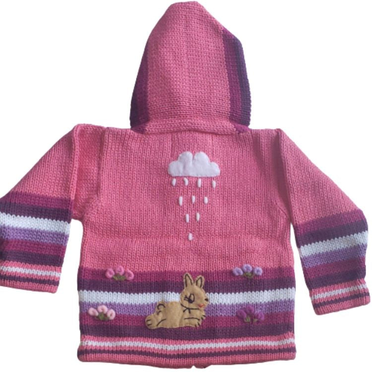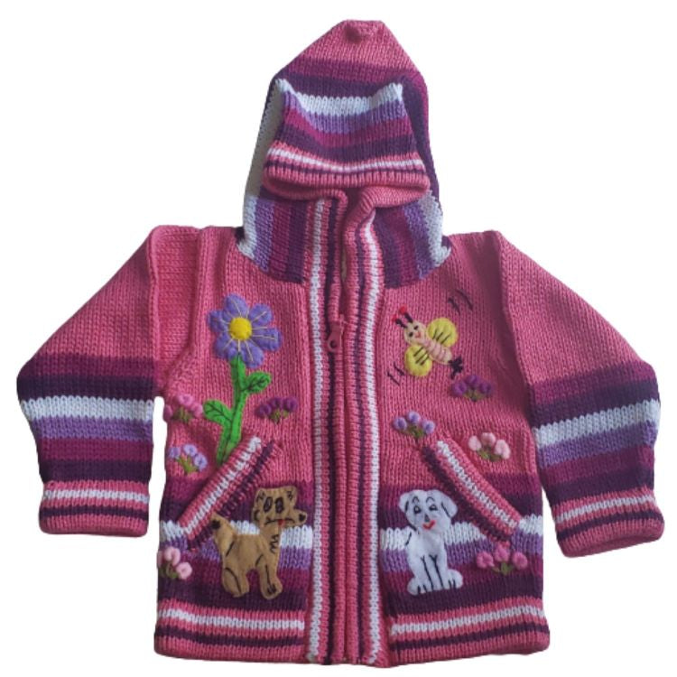This pink sweater is the GARDEN design. It is soft and unique with attached hood has everything to keep your child warm and cozy and happy this winter and through the year! showing the beautiful flowers and the magnificent BUMBLE BEE a good bug, an excellent garden's helper.