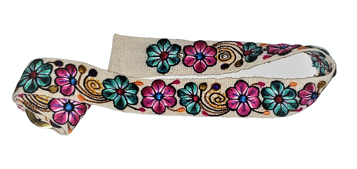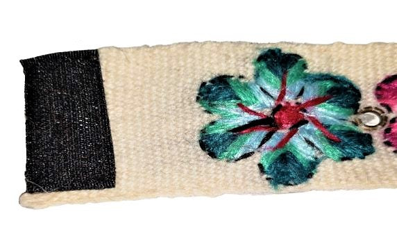 Hand-embroidered by Peruvian Artisans from Ayacucho. These beautiful flowers represent love and happiness to the wearer. Life is wonderful be happy is the belt's motto.