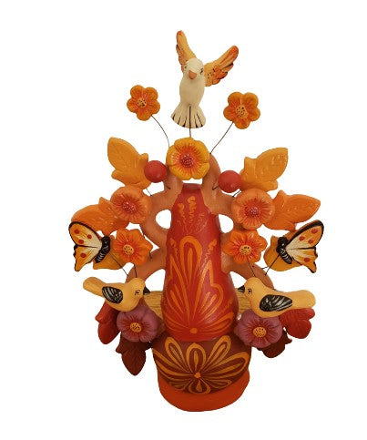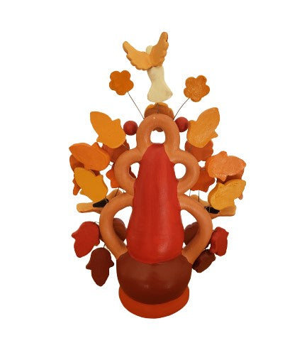 This delightful tree of life representing the Holy Spirit on top of the tree. Modeled in ceramic and painted by hand, birds, butterflies and flowers center a composition of joyous new leaves.