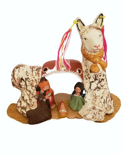 Talented crafters represented in the traditional Peruvian setting Mary and Joseph to worship the newborn Christ child. Crafted in ceramic and finely painted by hand, it celebrates Christmas in the Peruvian Way.